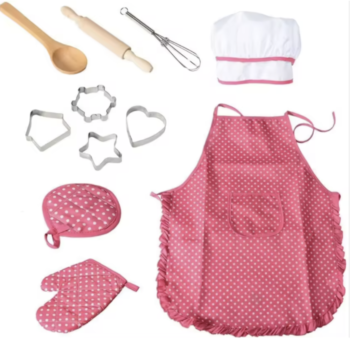 11 piese pentru joacă autentică: Setul include un șorț drăguț, oale, tigăi, ustensile de gătit (spatulă, lingură), farfurii, căni și poate chiar mici alimente false. Suficient de multe pentru a crea scenarii complexe de joacă, fără a fi copleșitor pentru copil.