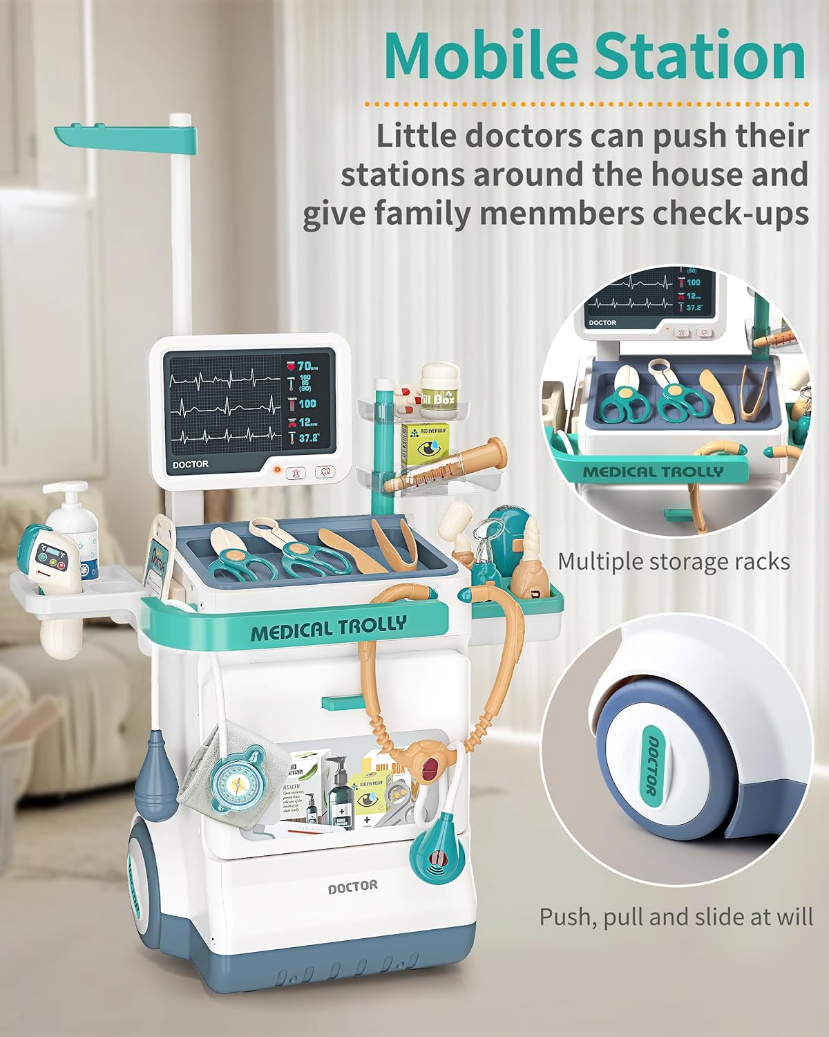 Caruciorul include rafturi spațioase și roți pivotante, fiind ușor de mutat în casă, curte sau terasă. Setul cuprinde instrumente medicale diverse: seringă, perfuzie, termometru, ciocan neurologic, oglindă și lampă dentară, foarfece chirurgicale, clește, pensetă, tablete și cutii care imită medicamente, precum și sabloane cu raze X și EKG.
