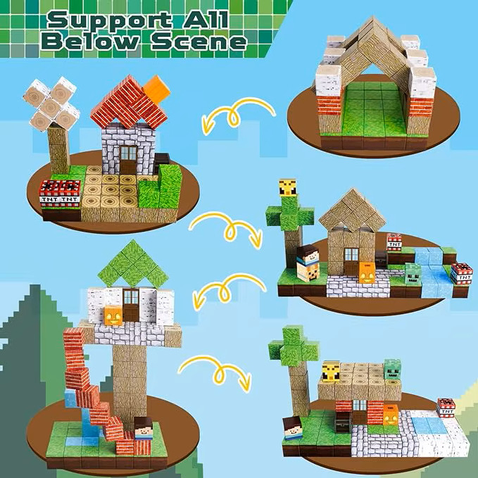 Construcție creativă și versatilă: Setul include o varietate de piese din plastic ABS de calitate, în culori vii, special concepute pentru a se îmbina cu ajutorul magneților încorporați. De la pereți și acoperiș până la ferestre și mici accesorii decorative, totul poate fi asamblat pentru a crea o cabană de poveste. Dar magia nu se oprește aici – piesele pot fi refolosite pentru a construi case cu alte forme, turnuri, sau chiar structuri abstracte, după cum îi dictează imaginația.
